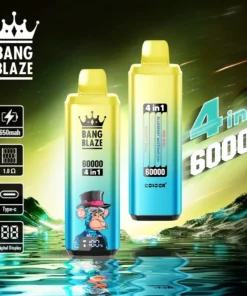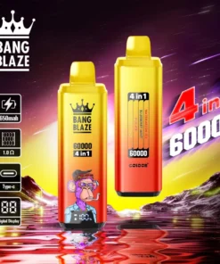 BANG BLAZE 60K 4v1 jednorázové vape s 60 000 dychmi, 60ml e‑tekutinou, 650mAh baterkou, rýchlym Type‑C nabíjaním, 1,0Ω Quad Mesh a 4v1 chutom s digitálnou obrazovkou.