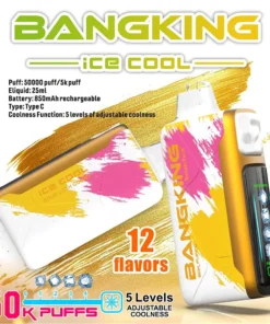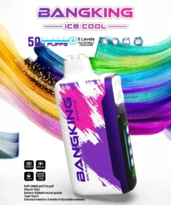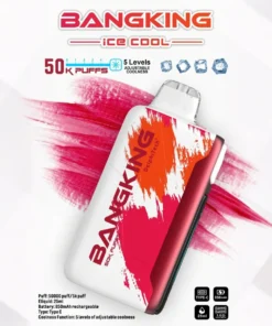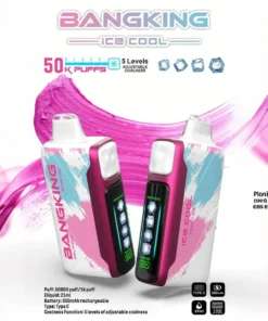 Bang King 50K Ice Cool jednorázové vape s 50 000 dychmi, 50ml e‑tekutinou, 850mAh baterkou, rýchlym Type‑C nabíjaním, 1,0Ω sietovým elementom a 5 úrovňami chladenia.